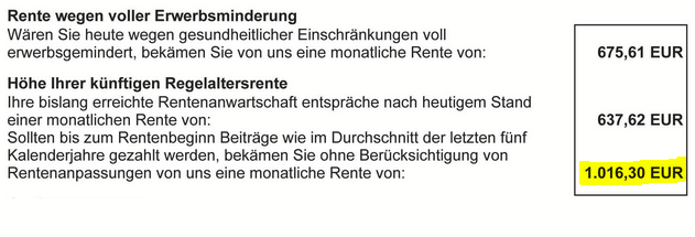 Wenn du älter als 27 bist und schon mehr als 5 Jahre gearbeitet hast, bekommst du einmal pro Jahr eine Renteninformation. Diese benötigst du für den zweiten Schritt, denn sie gibt dir Auskunft darüber, wie viel Rente du dir schon verdient hast und wie hoch die Rente sein würde, wenn du weiter so arbeitest, wie in den letzten 5 Jahren. Dies ist die dritte Zahl in der umrandeten Box auf Seite 1.